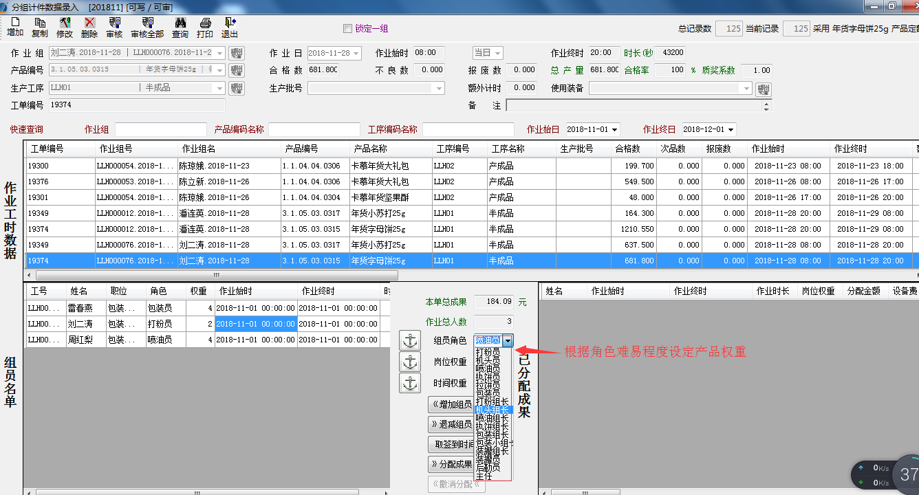 對于計件工資產品工序多且工序難易程度不一等綜合因素考慮,為了保證能夠正常快速統計分析員工個人參入計件所得,特別啟用角色加權重的模式,確保每個產品可以根據生產難易程度合理設置不同角色權重,如下圖: