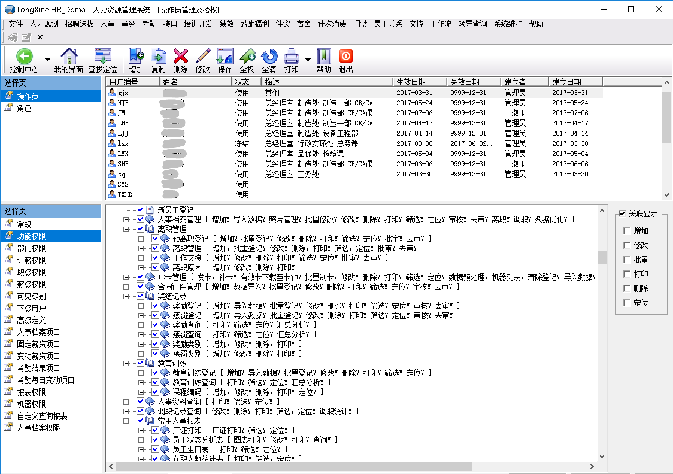 針對此種情況,同鑫HR系統(tǒng)結(jié)合眾多用戶的經(jīng)驗,設置了各種不能的權限管理模式,在分布式權限控制系統(tǒng)中職位與權限相結(jié)合,不因人的流動而造成職責的空缺。并且,既可以統(tǒng)一管理,又明確分工。合理的下放職權,亦可減輕各崗位的工作負擔。