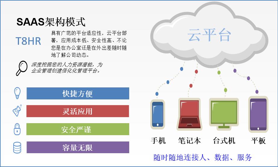 在此背景之下,同鑫科技運用大數(shù)據(jù)的成果,為多向公司搭建了eHR云平臺管理模式,無論是管理者還是員工,都可以通過筆記本電腦,手機,平板,臺式機等終端,實現(xiàn)線上線下隨時隨地連接人、數(shù)據(jù)和服務(wù)。