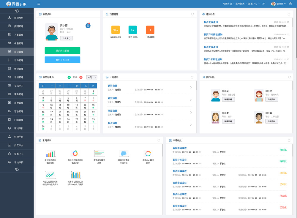 ● 常用報表:扁平化圖形顯示本人考勤情況,薪資情況分析;